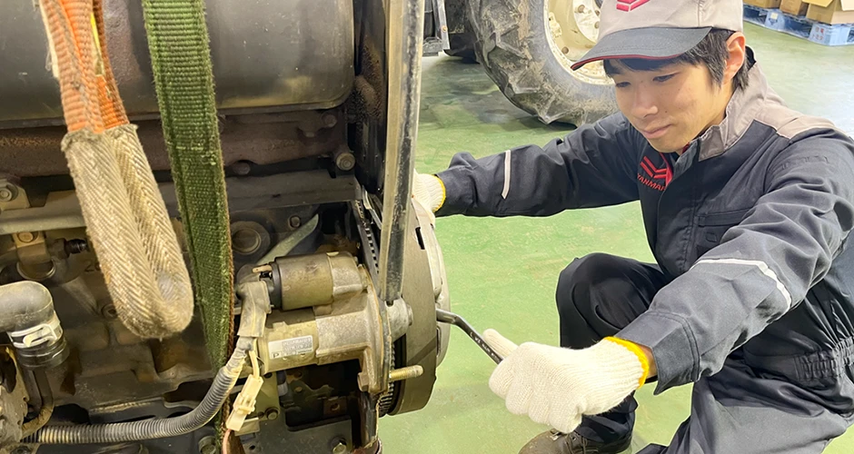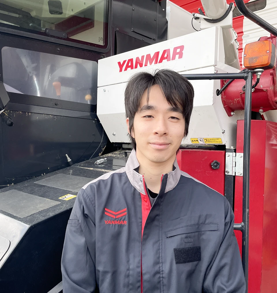 私は小さな時から機械が好きでその中でも農業機械は身近な存在でした。私の育った環境には農業を営まれている方が多く、いつもお世話になっている方たちに恩返しをしたいと考えていました。特にヤンマーの農業機械が多くこのトラクターを整備できるようになって地域貢献したいと思い入社しました。機械が好きな自分にとってベストマッチな会社を見つけることが出来ました。